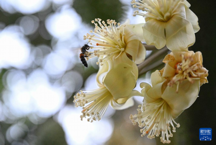 5月24日,在保亭优旗潘坡榴莲生态产业园,蜜蜂停留在榴莲树的花上。