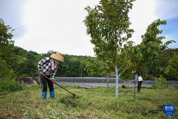 5月24日,农民在保亭优旗潘坡榴莲生态产业园为榴莲树施肥。