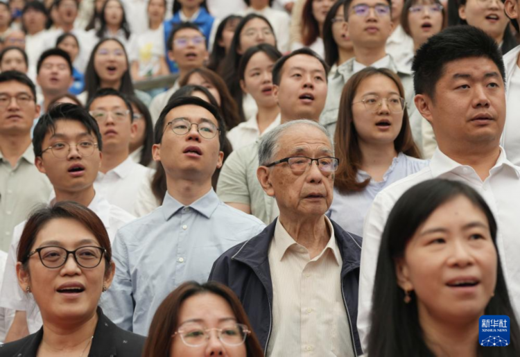 5月27日,师生代表和校友代表在大会上齐唱复旦大学校歌。
