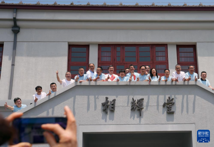 返校的校友在复旦大学校园内的相辉堂留影(5月24日摄)。