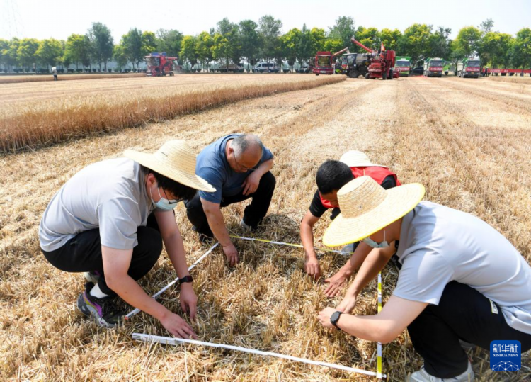 5月28日,在活动现场,工作人员在选定的采样区域捡拾掉落的麦粒。