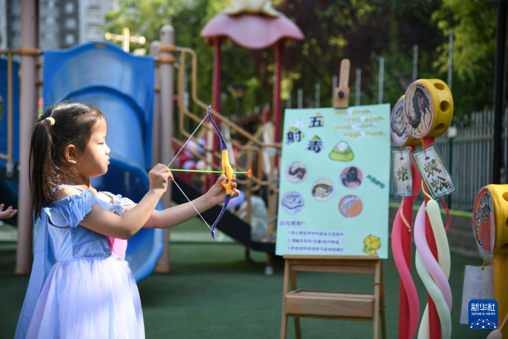 5月28日,在陕西省西安市明园幼儿园,小朋友体验“射五毒”游戏。