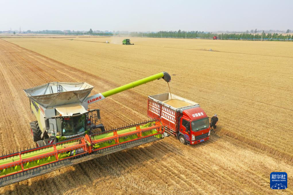 5月29日,在河南省周口市西华县黄泛区实业集团农业第四分公司的麦田里,农机手操作收割机将收获的小麦装车(无人机照片)。