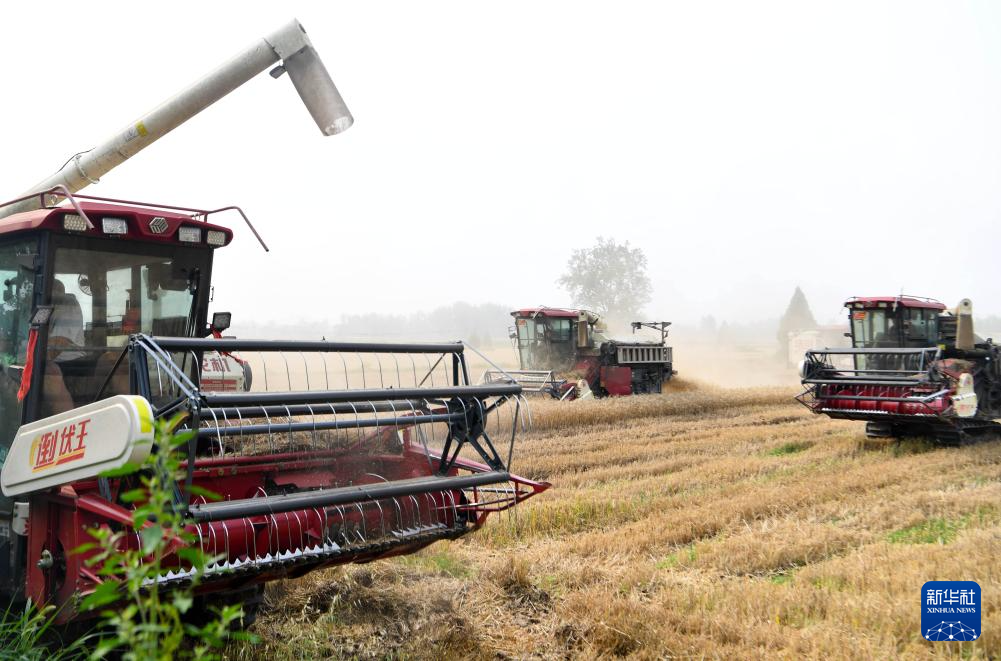 5月27日,在河南省信阳市淮滨县马集镇,履带式收割机在麦田收获弱筋小麦。