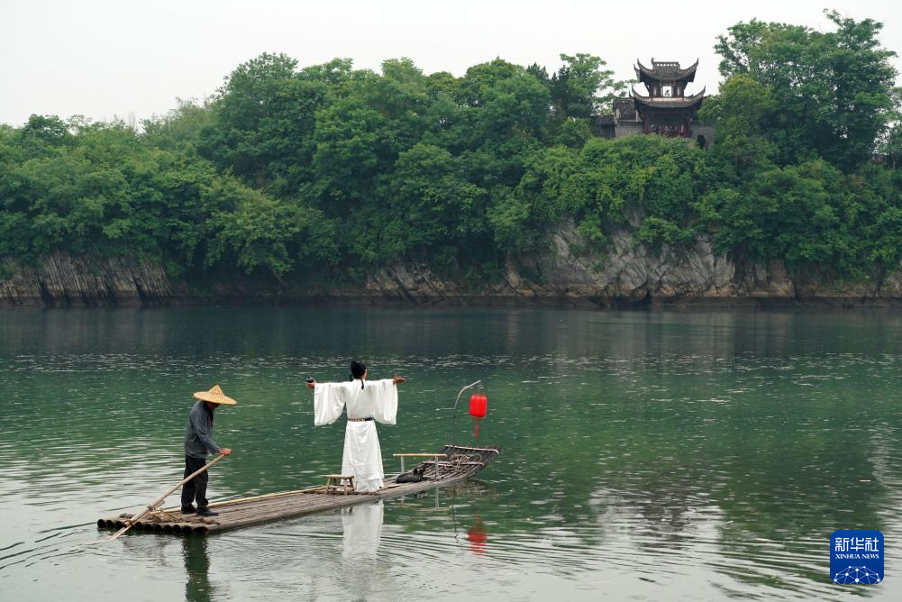 5月15日,在安徽省宣城市泾县桃花潭景区,一名男子扮演李白乘竹筏赏景。
