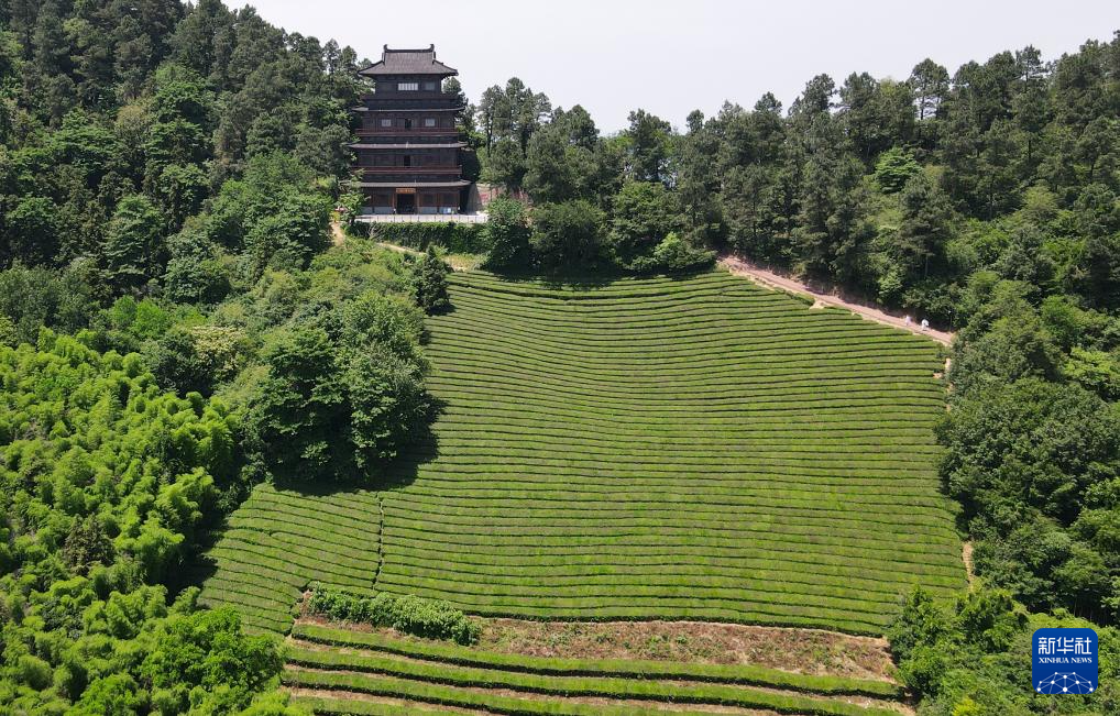 5月14日在安徽省宣城市敬亭山拍摄的太白独坐楼和茶园风光(无人机照片)。