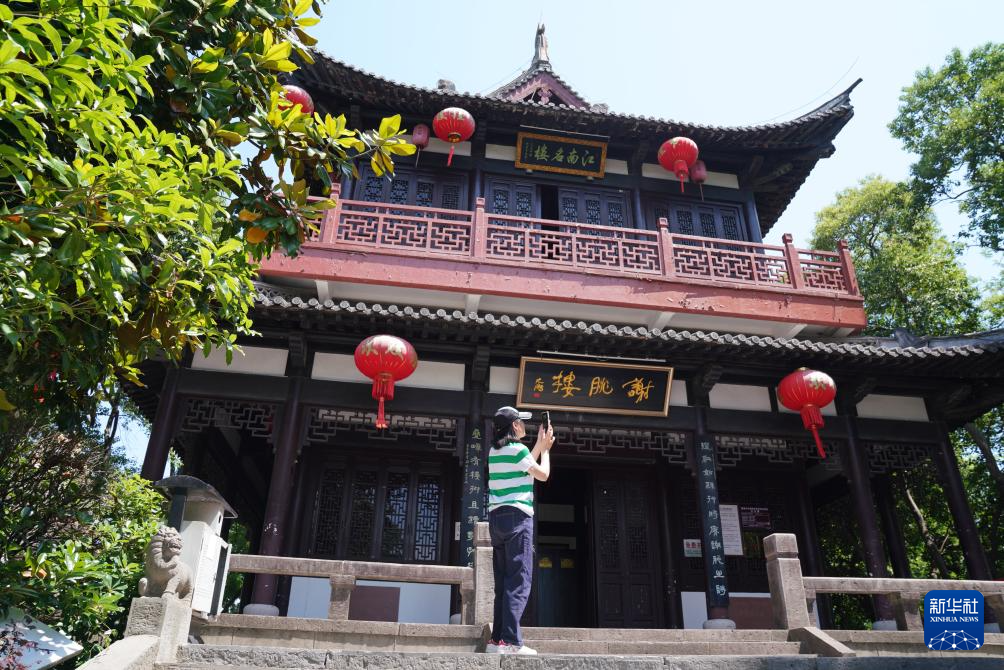 5月14日,游客在安徽省宣城市谢朓楼前拍照。