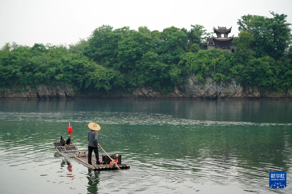 5月15日,在安徽省宣城市泾县桃花潭景区,工作人员在水面划竹筏。
