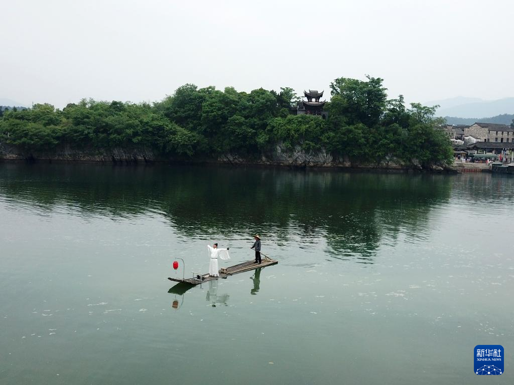5月15日,在安徽省宣城市泾县桃花潭景区,一名男子扮演李白乘竹筏赏景(无人机照片)。