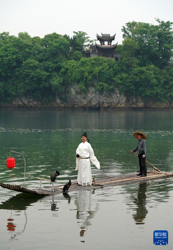 5月15日,在安徽省宣城市泾县桃花潭景区,一名男子扮演李白乘竹筏赏景。