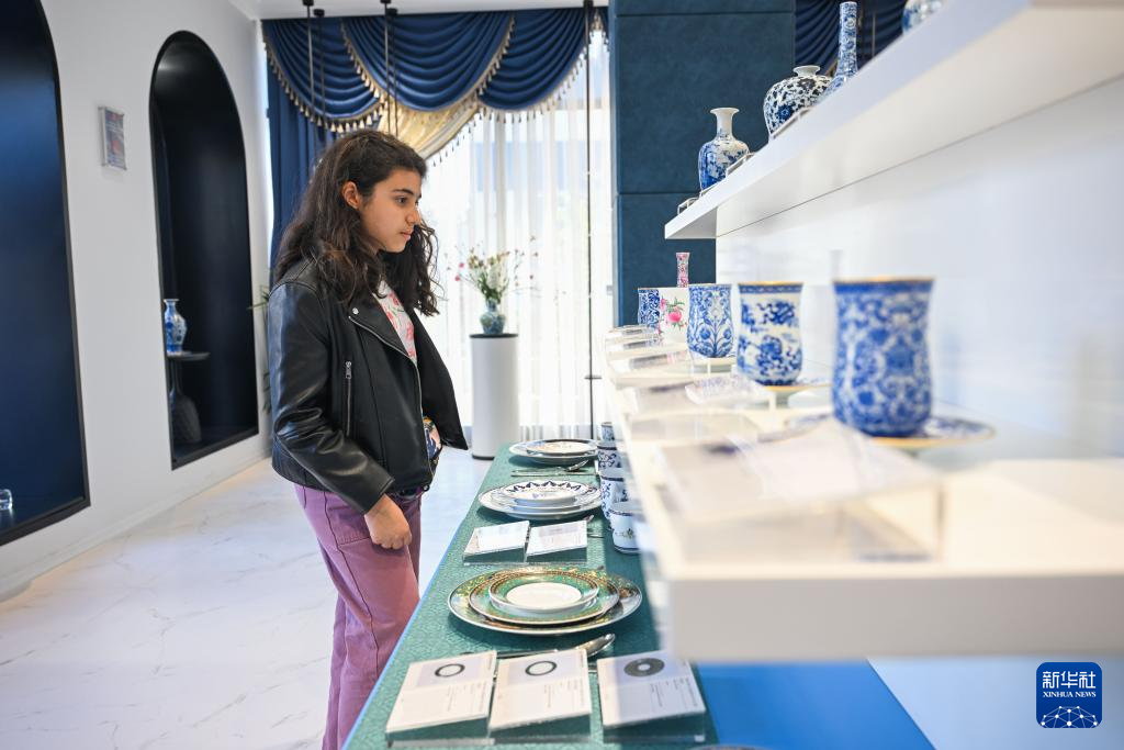 5月31日,在土耳其伊斯坦布尔,顾客在景德镇陶瓷官方旗舰店内查看中国瓷器。