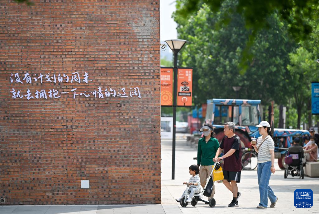 市民在天津天拖片区城市更新项目的街区内休闲(5月30日摄)。