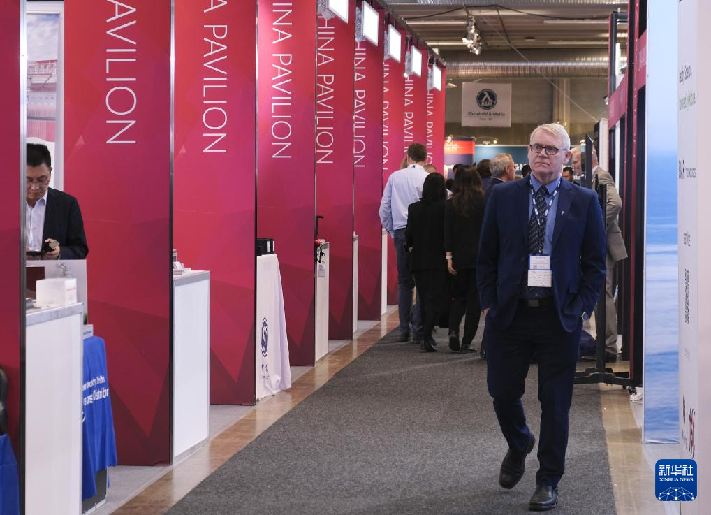 6月3日,在挪威利勒斯特伦举办的挪威国际海事展上,与会者参观中国馆。新华社记者 张玉亮 摄