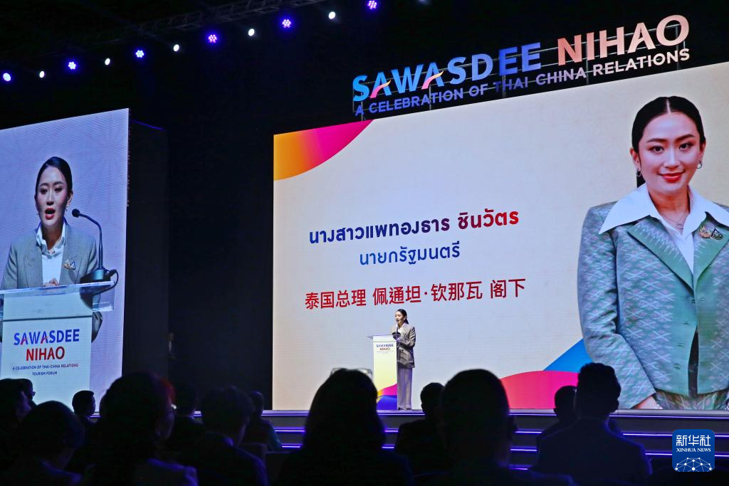 5月29日,在泰国首都曼谷,泰国总理佩通坦在“萨瓦滴·你好”推广活动的启动仪式上致辞。