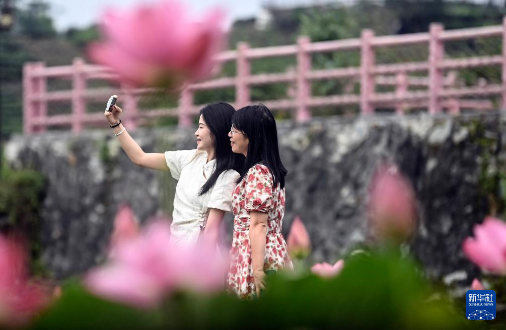 6月4日,在广西三江侗族自治县良口乡和里村,游客在盛放的荷花旁拍照留念。