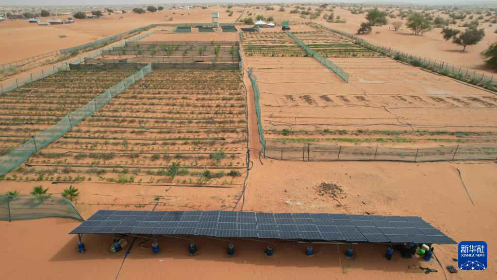 这是5月22日拍摄的位于毛里塔尼亚西部特拉扎区比尔·巴尔卡村的中非绿色技术公园(无人机照片)。新华社记者 司源 摄