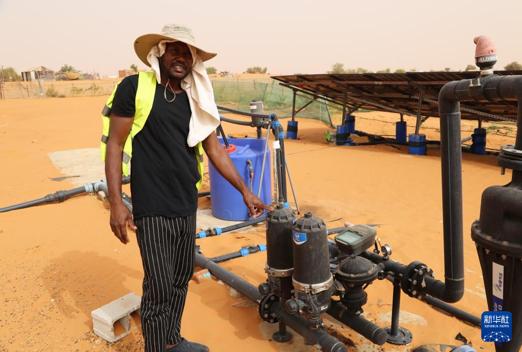 5月22日,在毛里塔尼亚西部特拉扎区比尔·巴尔卡村,中非绿色技术公园园区灌溉技术工人穆罕默德·伊塞勒穆介绍园区智能灌溉设备。新华社记者 司源 摄