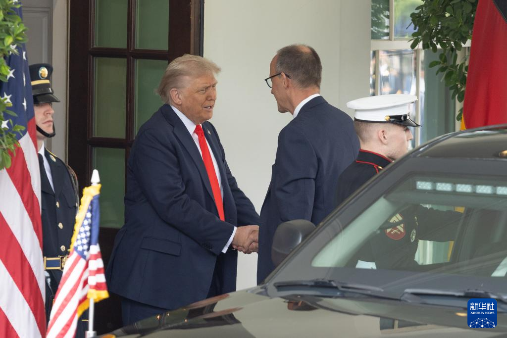 6月5日,美国总统特朗普在华盛顿白宫迎接到访的德国总理默茨。新华社记者 胡友松 摄