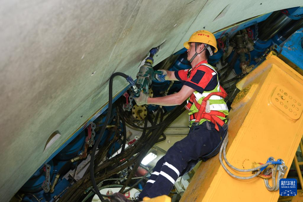 6月5日,中铁十一局技术人员在甬舟铁路金塘海底隧道“定海号”盾构机内进行管片拼装作业。