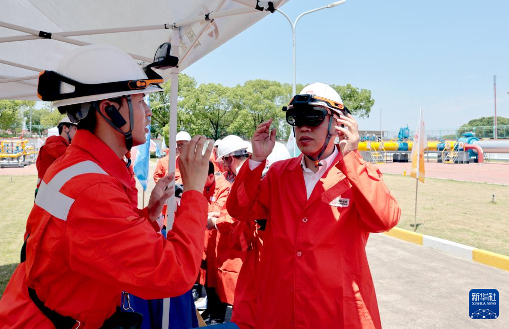 6月5日,参观者(右)在工作人员指导下体验使用集成在安全帽上的智能管路巡检设备。