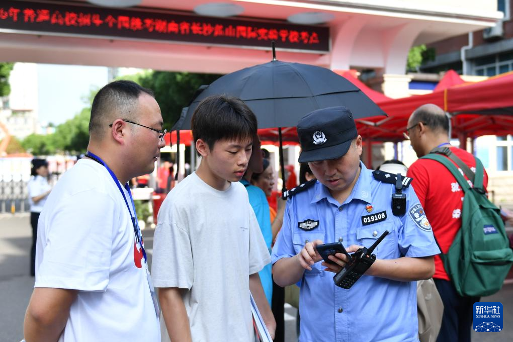6月7日,在湖南省长沙麓山国际实验学校考点外,民警为遗落身份证的考生办理手续。