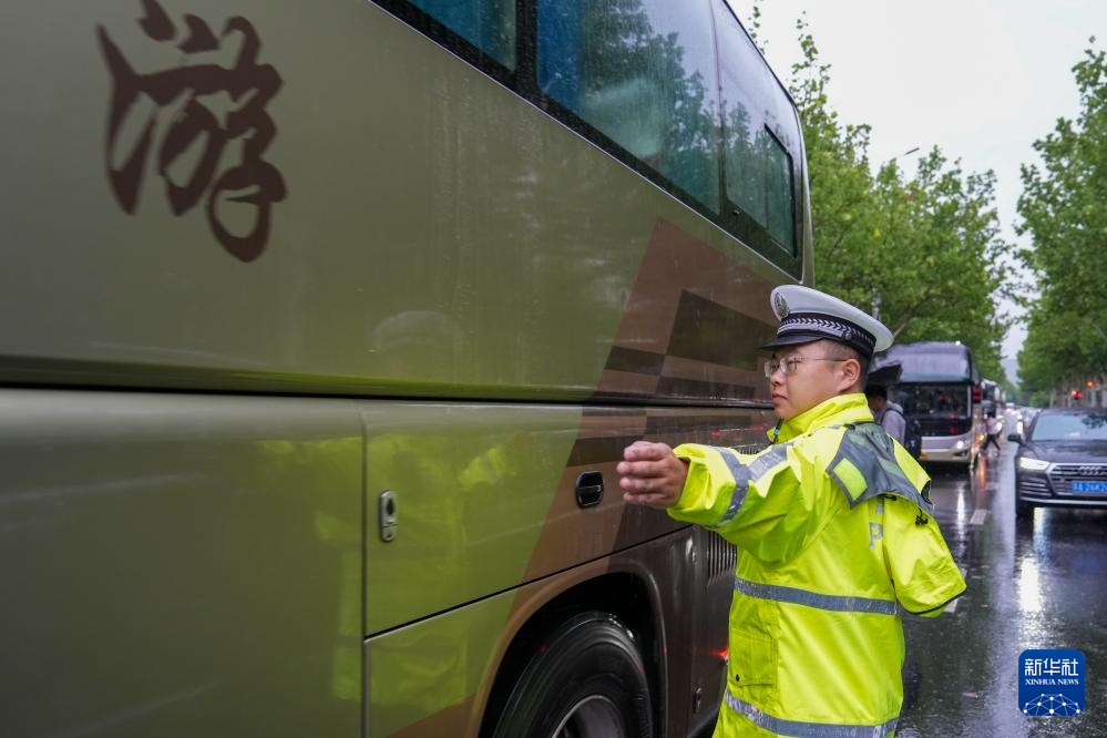 6月7日,在南京市建邺区中华中学考点外,南京交警四大队的交通警察在指挥交通。