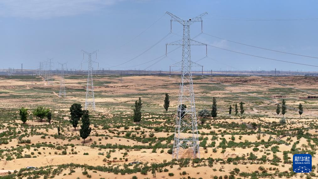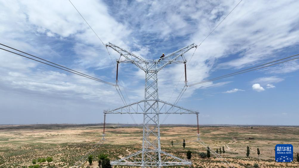6月8日拍摄的宁国运灵武100万千瓦光伏复合项目330千伏输变电工程线路(无人机照片)。