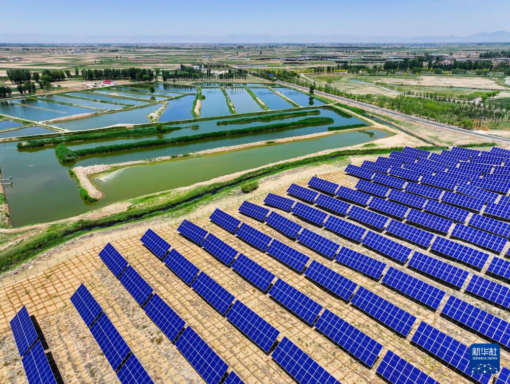 在内蒙古巴彦淖尔市临河区,国营新华林场防沙治沙和光伏一体化工程建设已初具规模(6月5日摄,无人机照片)。