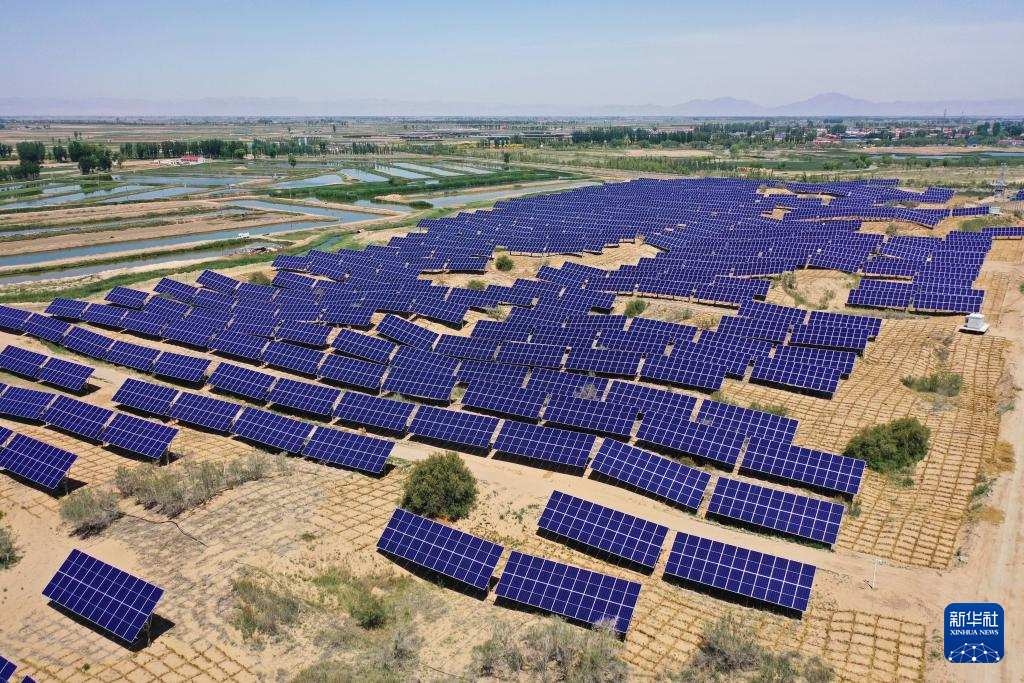 这是6月5日拍摄的位于巴彦淖尔市磴口县的乌兰布和东北部新能源基地100万千瓦光伏先导工程项目,该项目地处乌兰布和沙漠(无人机照片)。