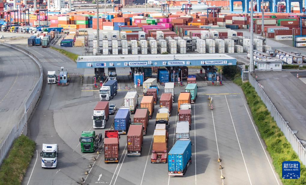 5月28日,货车排队进入德国汉堡港口与物流股份公司旗下的汉堡港CTT集装箱码头。新华社记者 张帆 摄