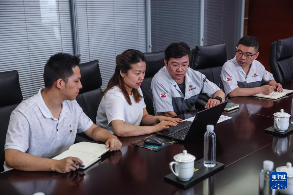 6月10日,在嘉兴市南湖区振石集团东方特钢有限公司会议室,驻企“红色专班”党员(左一、左二)帮助企业进行项目备案。