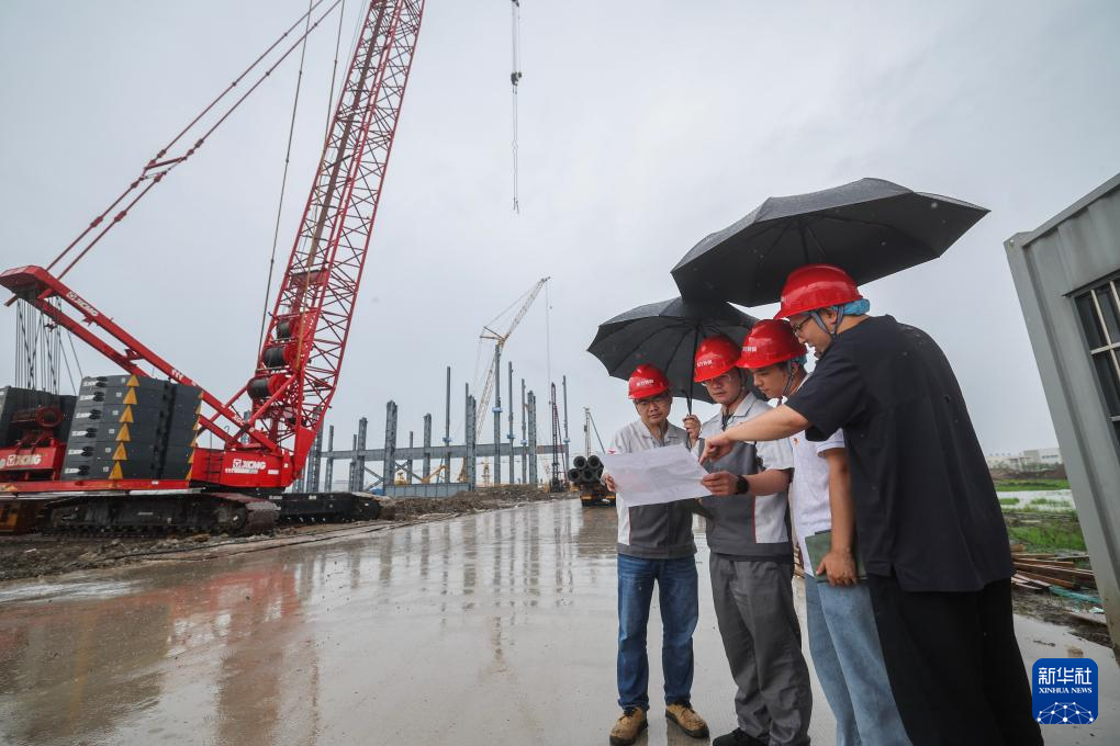 6月10日,在东方特钢镍铬新材智造项目建设现场,嘉兴市南湖区驻企“红色专班”党员(右一、右二)与企业施工方一起查看项目现场推进情况。