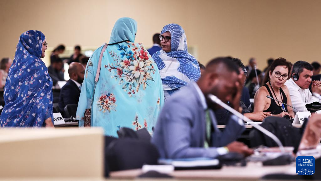 6月10日,在法国南部城市尼斯,与会嘉宾在第三届联合国海洋大会一般性辩论现场交谈。