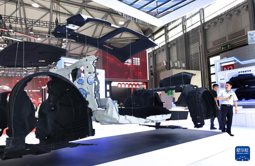 6月5日,参观者在一组低碳材料汽车内饰展品旁驻足观看。