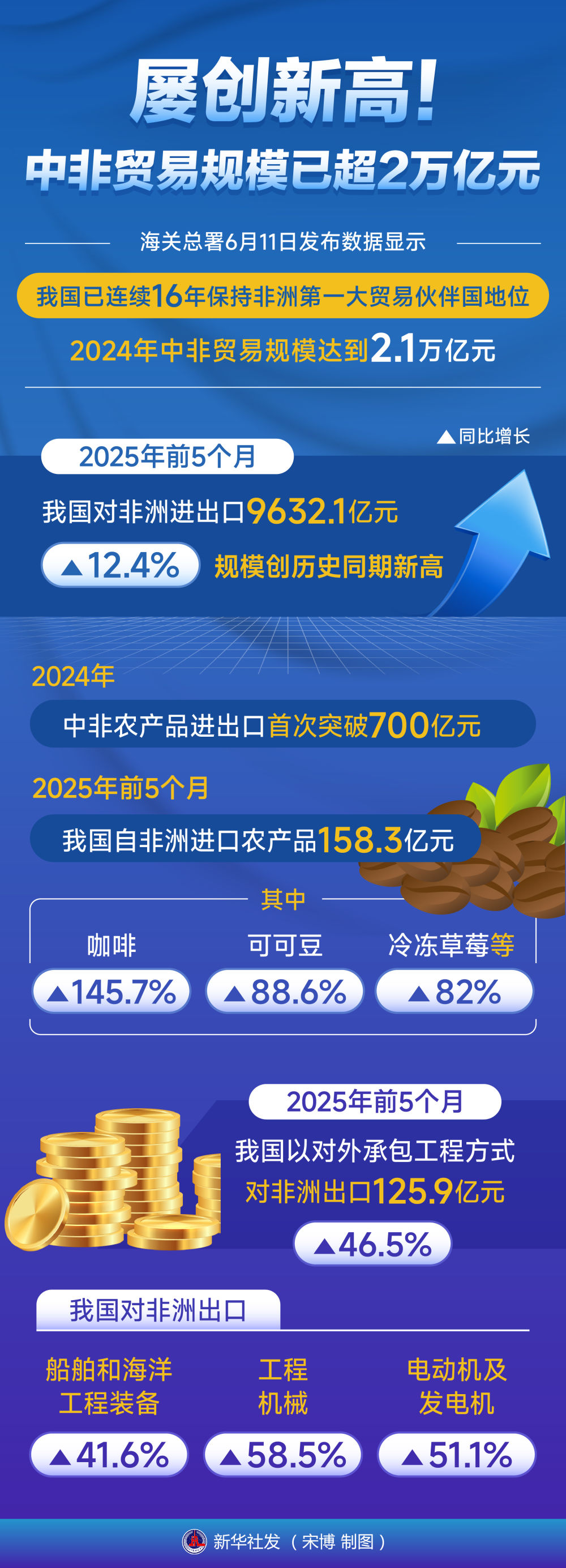 新华社北京6月11日电(记者张晓洁、邹多为)自2000年中非合作论坛成立以来,中非贸易规模屡创新高。海关总署11日发布数据显示,我国已连续16年保持非洲第一大贸易伙伴国地位,2024年,中非贸易规模首破2万亿元,达到2.1万亿元。