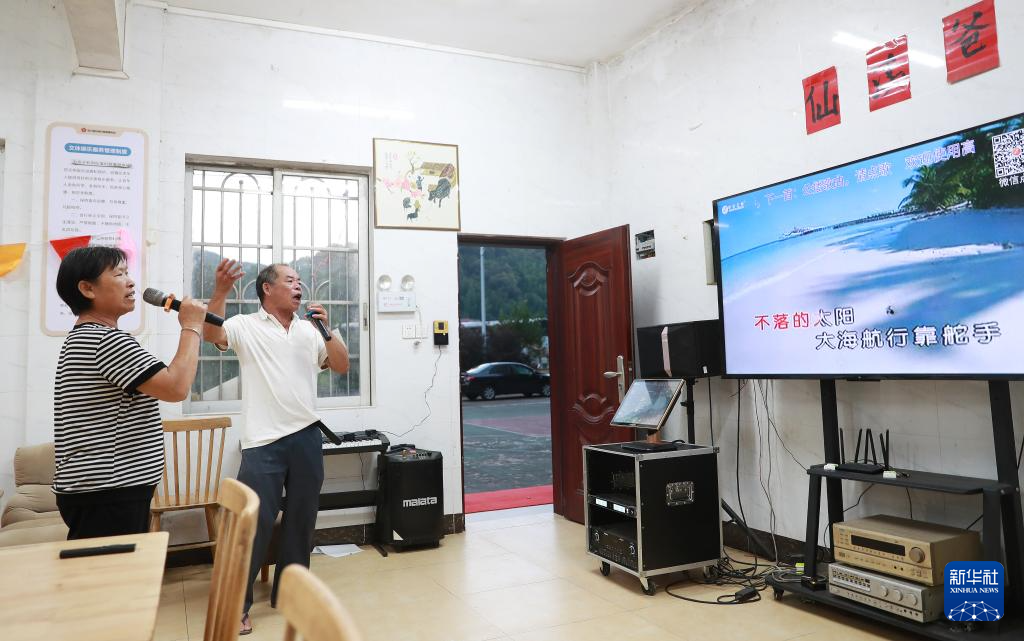 6月10日,晚饭后,仙溪村老人在长者饭堂里唱歌娱乐。