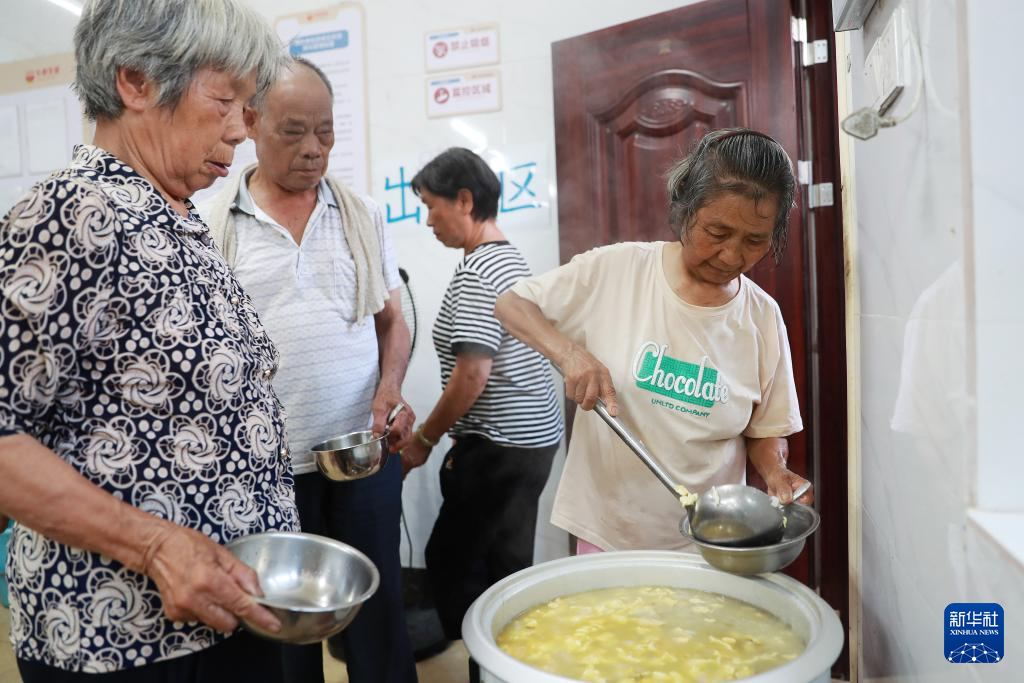 6月10日,仙溪村老人在长者饭堂里排队盛汤。