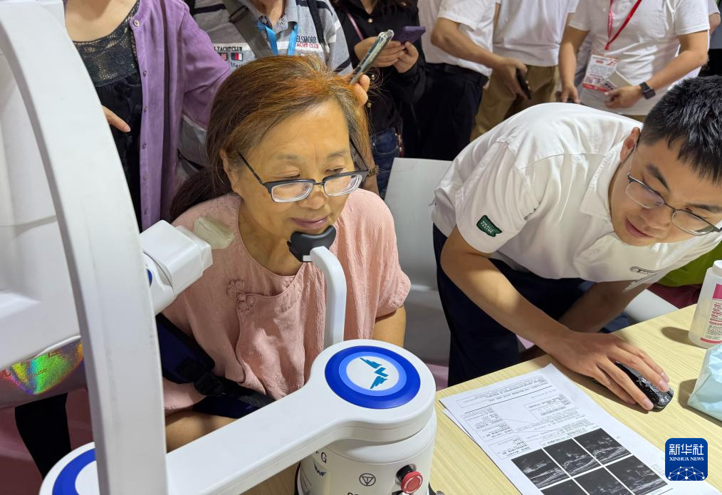 6月11日,一名参观者在博览会上体验颈动脉筛查机器人。
