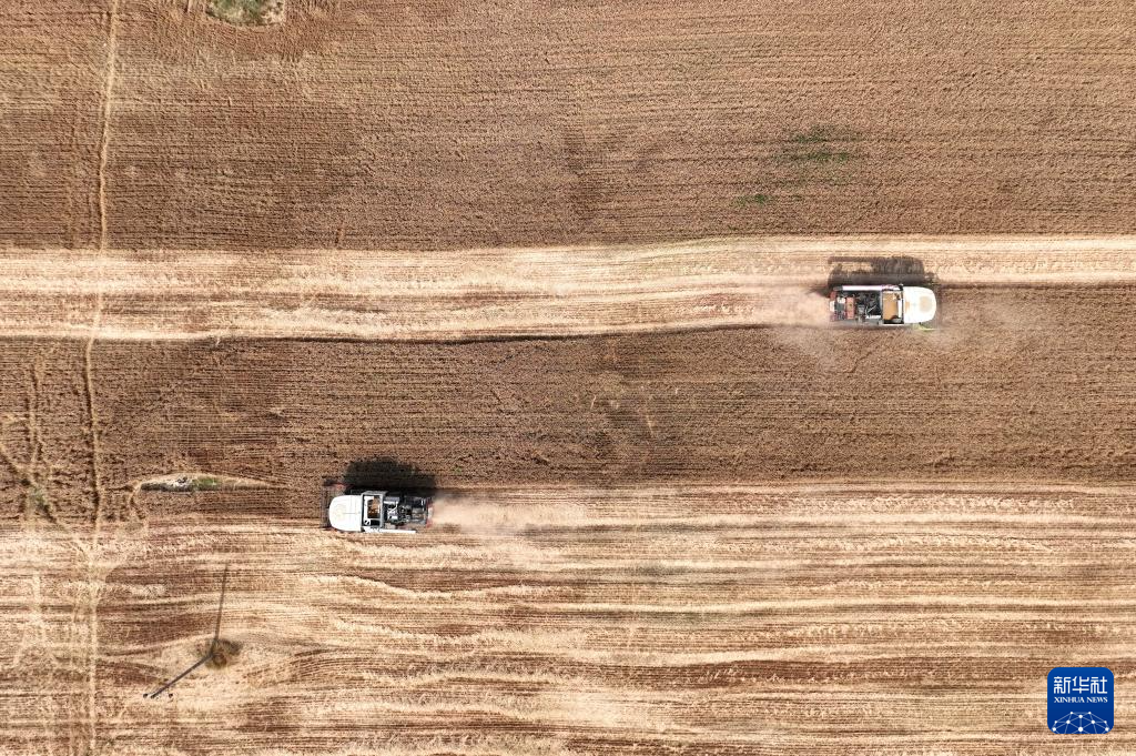 6月12日,收割机在河北省邢台市隆尧县双碑乡西良村麦田里收获小麦(无人机照片)。