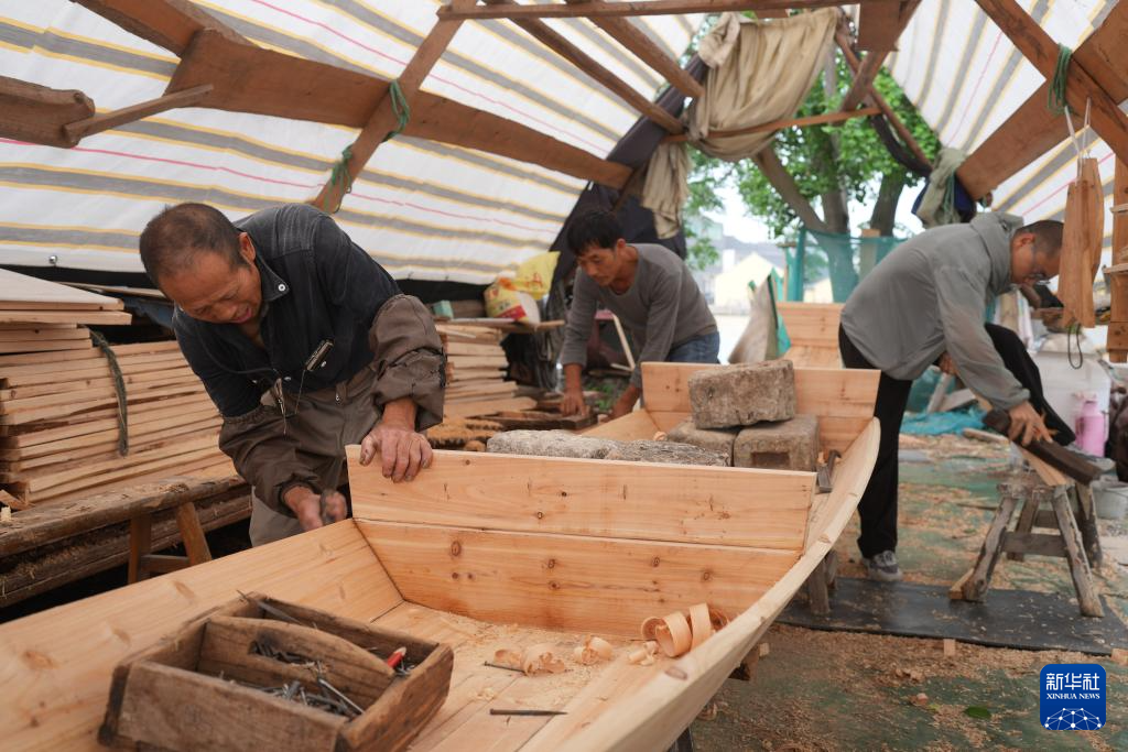 6月12日,钱寿堂带着徒弟制造乌篷船。