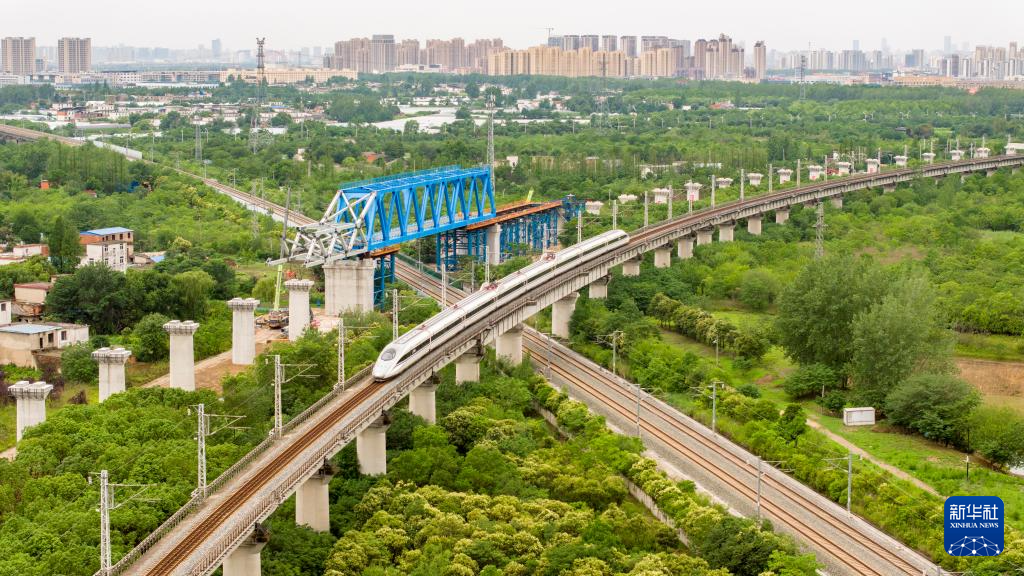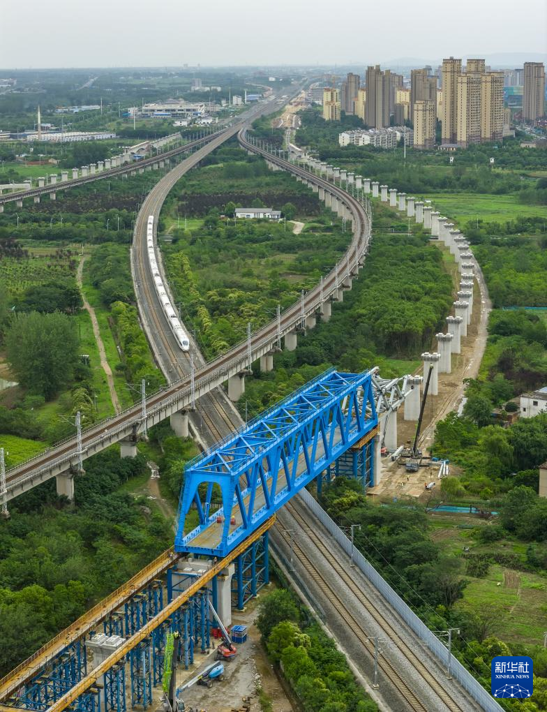 新建沪宁合高铁钢桁梁跨越沪蓉铁路(6月15日摄,无人机照片)。