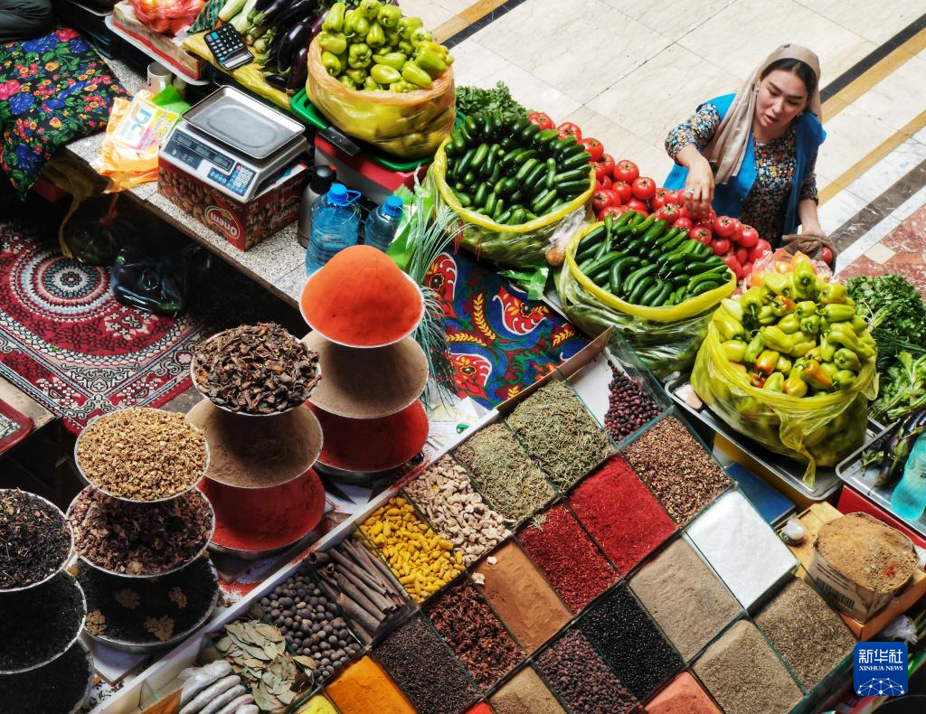 这是2024年7月3日在塔吉克斯坦首都杜尚别拍摄的大巴扎内售卖的蔬菜和香料。