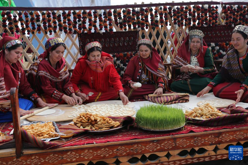 2015年3月21日,在土库曼斯坦首都阿什哈巴德,妇女们在庆祝纳乌鲁斯节活动中准备食品。纳乌鲁斯节(又称诺鲁孜节)是中亚国家最重要的传统节日之一,标志着春天的到来和新的一年开始。