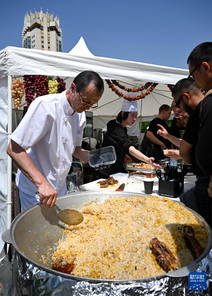 2025年5月1日,在哈萨克斯坦阿拉木图,工作人员盛取抓饭。