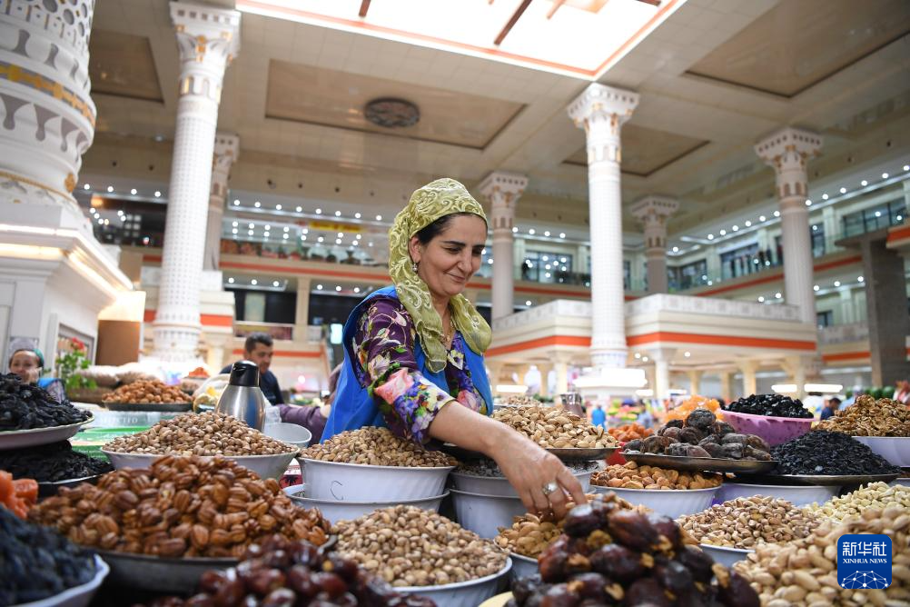2019年6月10日,在塔吉克斯坦首都杜尚别,一名商贩售卖干果。