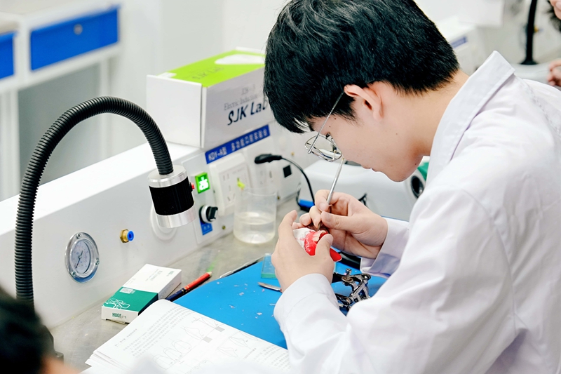 “目前正在进行的是全口义齿工艺技术课程,光看书本听讲课肯定是远远不够的,口腔医学实践性强,加强实操才能让学生学到真本事,未来走上工作岗位直接发挥所学。”该校口腔医学技术教师刘佳峰告诉记者。