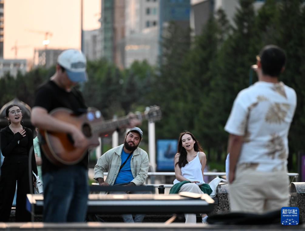 6月11日,在哈萨克斯坦首都阿斯塔纳,人们欣赏街头歌手演唱歌曲。
