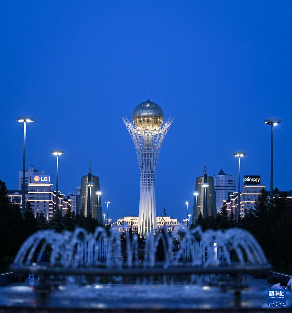 这是6月11日在哈萨克斯坦首都阿斯塔纳拍摄的巴伊杰列克观景塔。