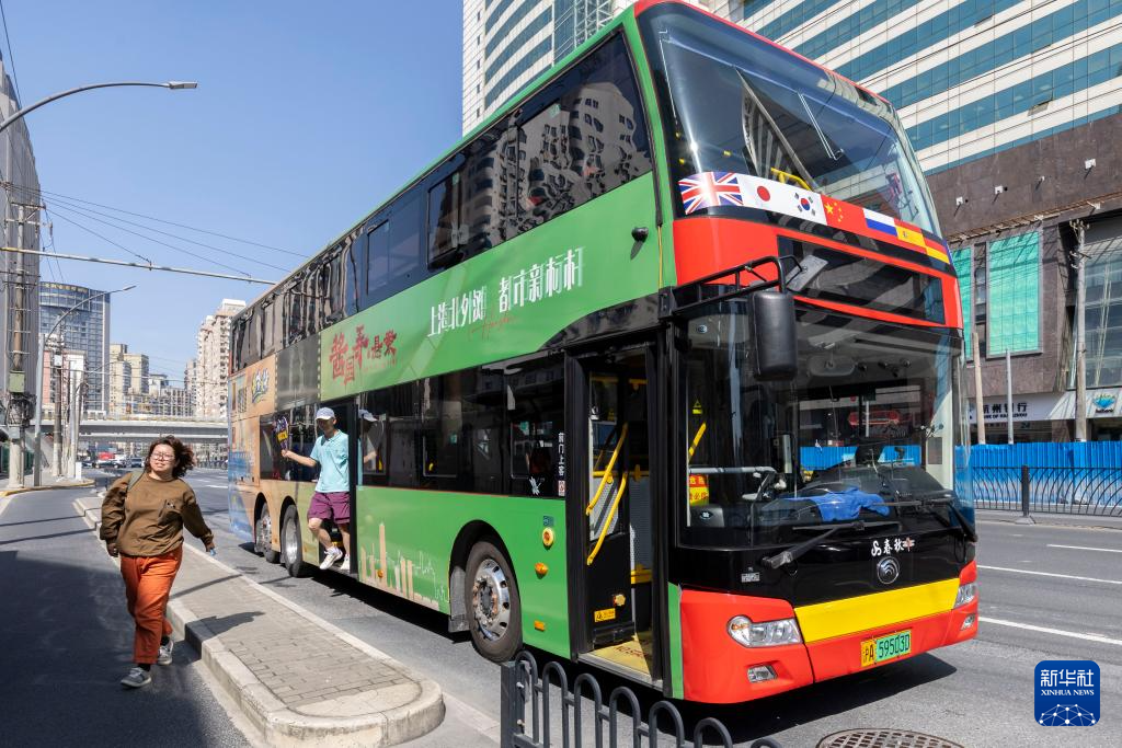 6月16日拍摄的“跟着《酱园弄·悬案》去旅行”主题双层观光巴士。市民可乘坐观光巴士打卡虹口区文化地标。