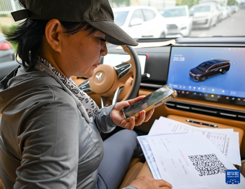 6月10日,在新疆霍尔果斯,高云在接到要运送的中国新能源汽车后,扫码录入出境所需的个人信息。